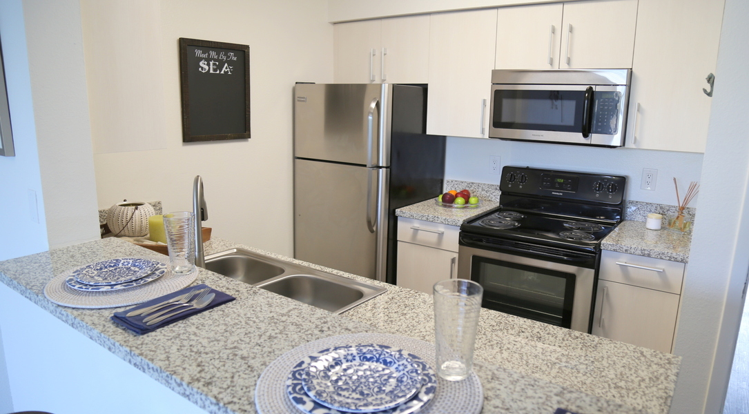 Amenities include modern kitchen with stainless appliances, granite counter-tops, bathtub, water heater, and tiled floors. Fully air conditioned.